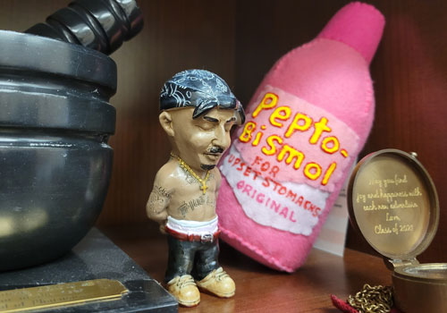 Nestled between a couple of College-related mementos are a Tupac figurine and a handmade Pepto Bismol plushie.
