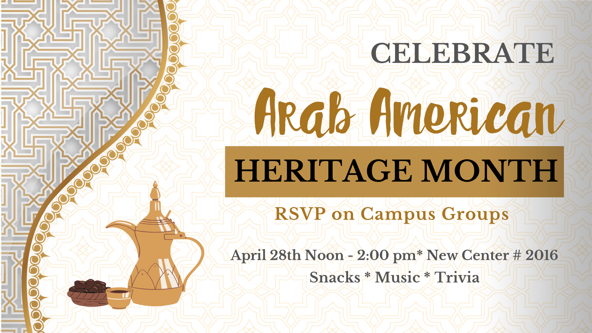 Join us as we celebrate Arab American Heritage Month. Take a break and enjoy Arab snacks, tea, music and trivia.