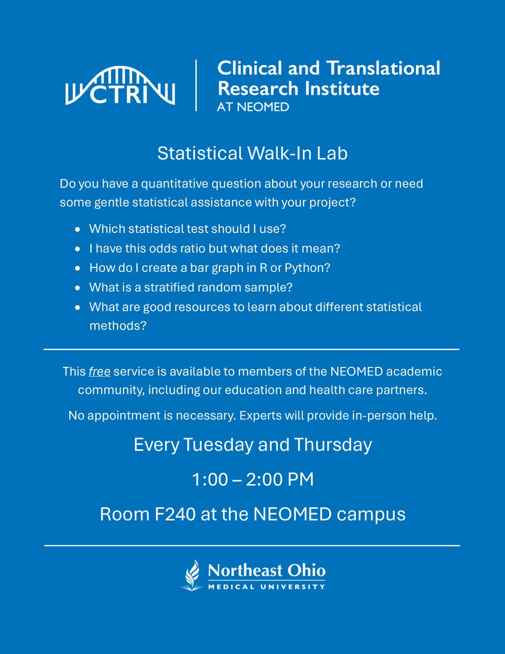 The Clinical and Translational Research Institute (CTRI) will begin offering a free statistical “walk-in” lab service to anyone engaged in research within the NEOMED community starting the week of July 1, 2024.