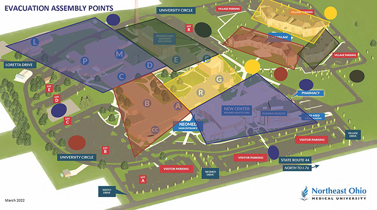 Always know TWO ways out of the building, wherever you are on campus. In the event there is a building evacuation, your routine exit may not be accessible, so it’s good to know another way out. To assist departments in accountability of employees and students, evacuation assembly points have been identified.