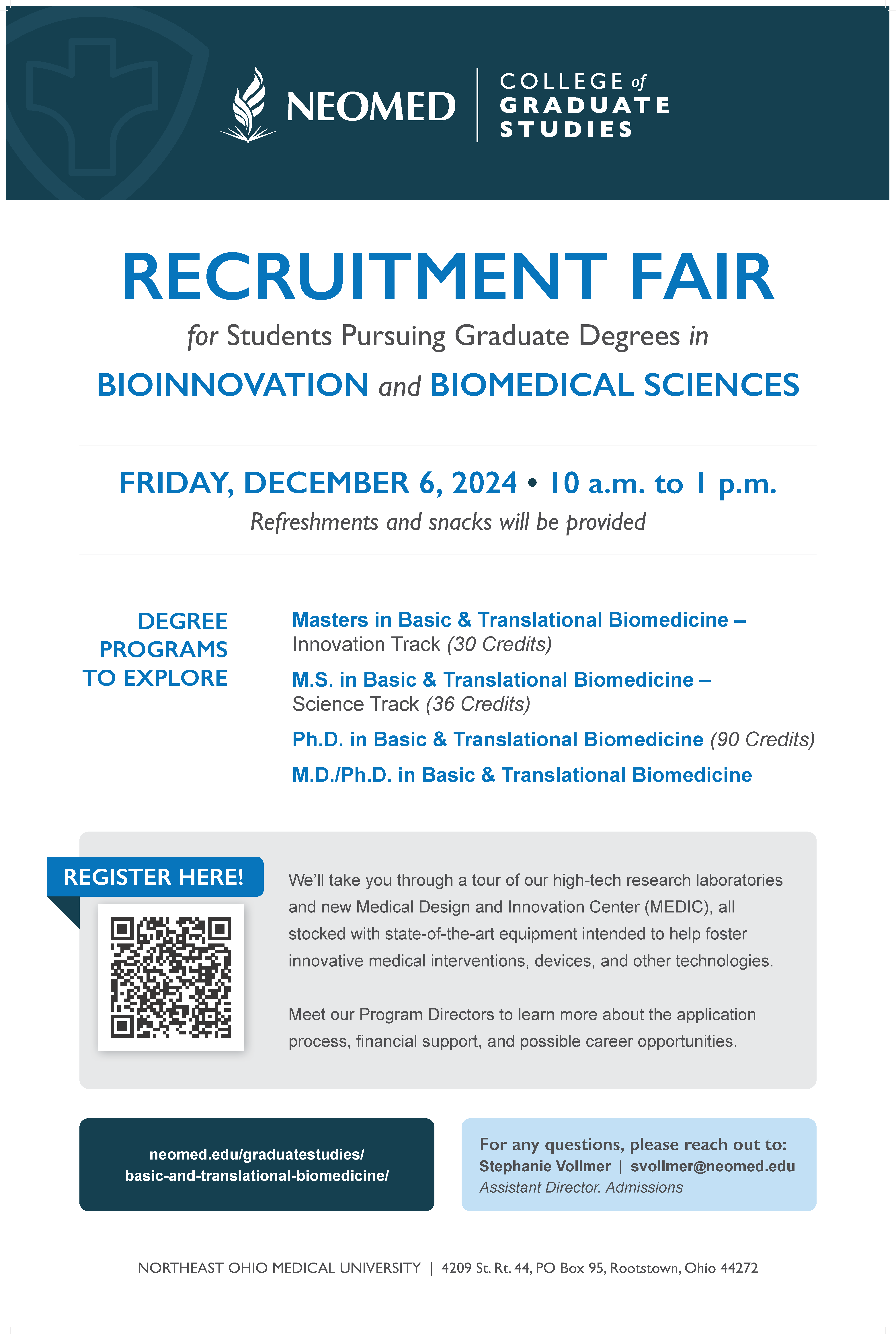 The NEOMED College of Graduate Studies will host a recruitment fair for undergraduate students interested in pursuing graduate degrees in bioinnovation and biomedical science. The fair will be held from 10 a.m. to 1 p.m. Friday, Dec. 6, 2024, in the Medical Design and Innovation Center (MEDIC).