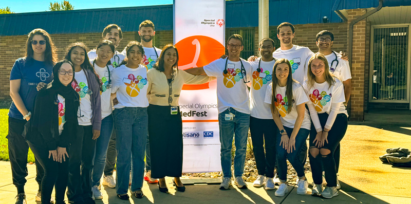 Noha Dardir, M.D., a family medicine physician at MetroHealth in Cleveland, graciously volunteered her time to perform free sport physicals during the Healthy Athletes Medfest for Special Olympics athletes with the assistance of M1 and M2 volunteers. Throughout the morning, athletes arrived, and either before or after they received their physicals, they attended sessions with Rebecca Fischbein, Ph.D., and College of Medicine students to learn about nutrition and adaptive cookware.
