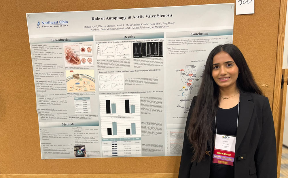 Maham Alvi, M3, below, presented "Role of Autophagy in Aortic Valve Stenosis" with coauthors Klarens Menage, M2, Song Shin, Postdoctoral Fellow Integrated Medical Sciences, and Feng Dong, Associate Professor of Integrated Medical Sciences.