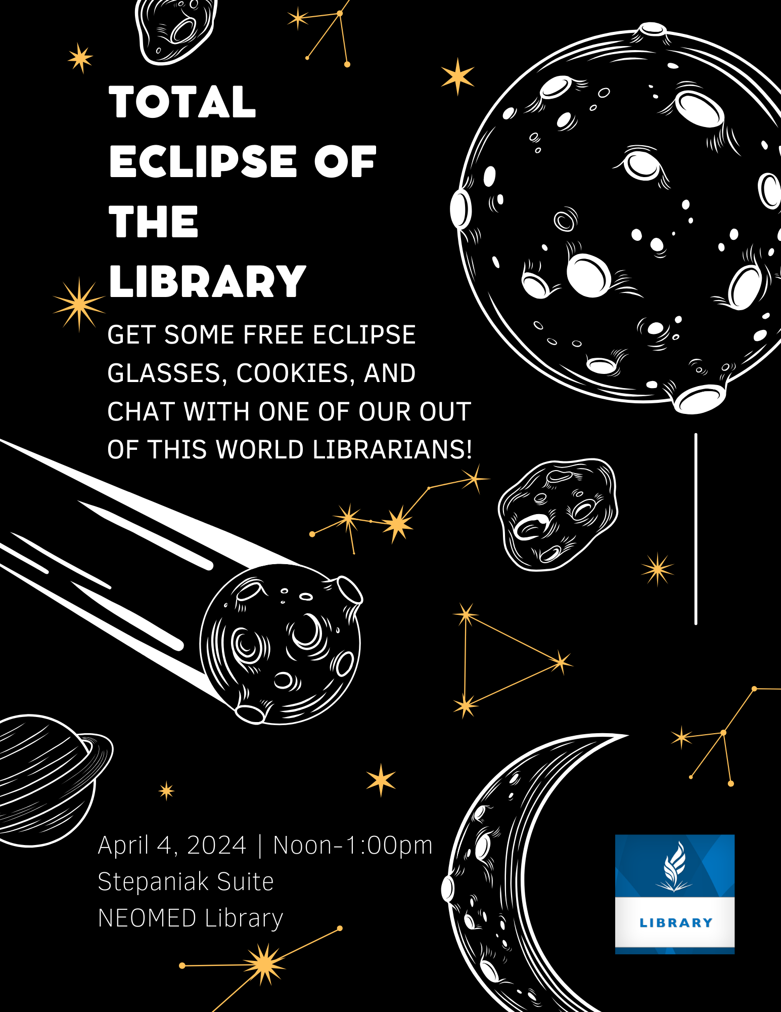 Stop by the library on Thursday, April 4, from noon-1 p.m. and get your free eclipse glasses! Librarians will have information on properly viewing the eclipse. Cookies will also be available.