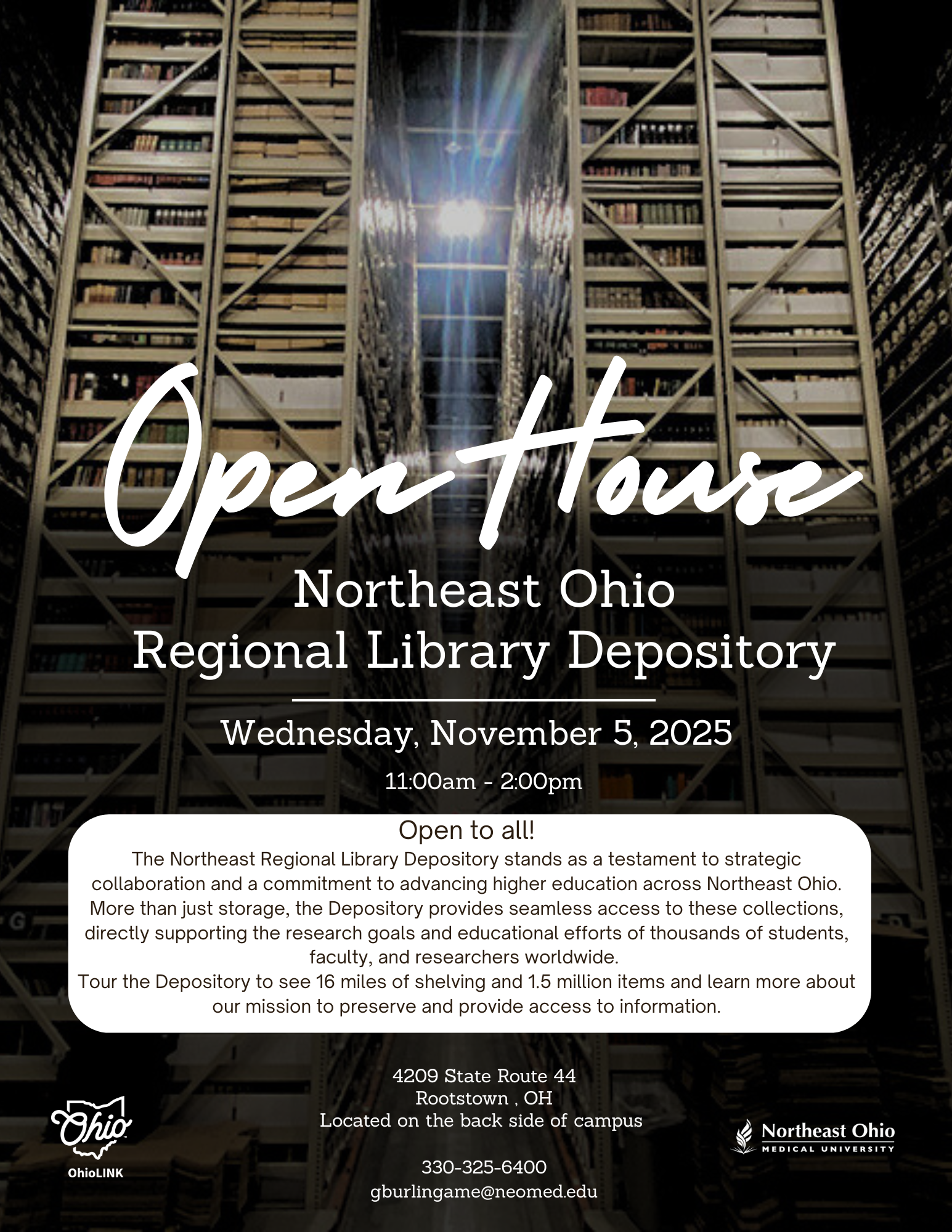 The Northeast Ohio Regional Library Depository will host an Open House on Wednesday, Nov. 5, from 11 a.m.-2 p.m.