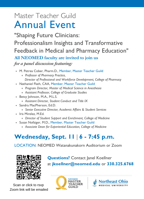 The Master Teacher Guild will hold a panel discussion titled “Shaping Future Clinicians: Professionalism Insights and Transformative Feedback in Medical and Pharmacy Education,” from 6 to 7:45 p.m., Wednesday, Sept. 11 in Watanakunakorn Auditorium and via Zoom.