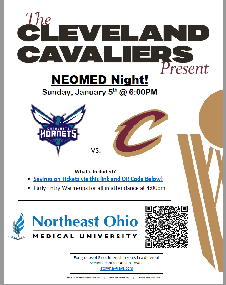 It will be NEOMED Night when the Cavs play Charlotte at 6 p.m., Sunday, Jan. 5, at Rocket Mortgage Fieldhouse.