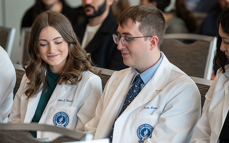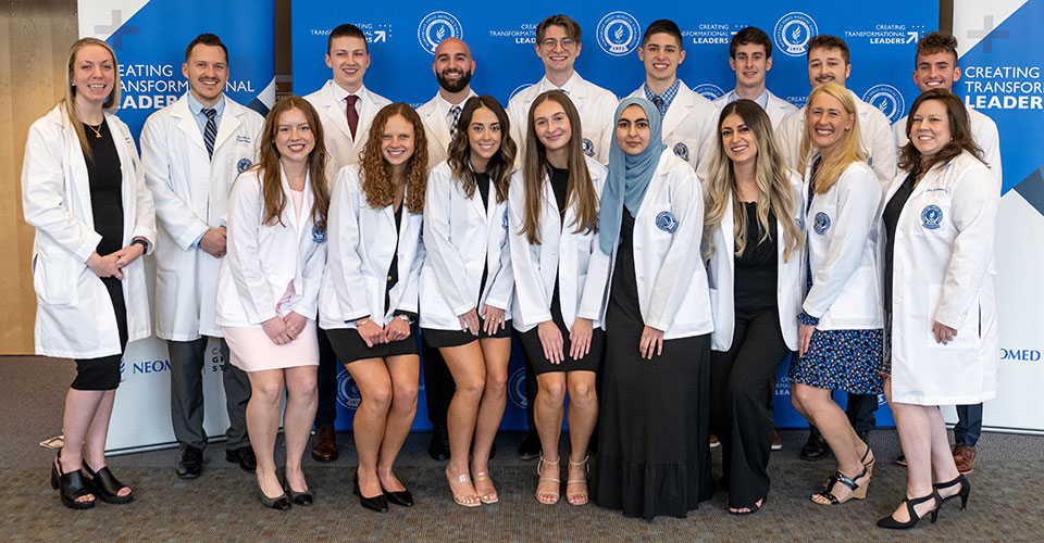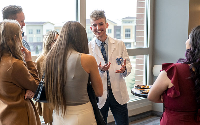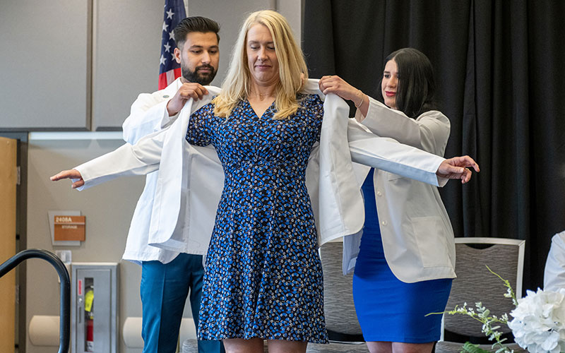The students in the 2026 class of the Master of Medical Science in Anesthesia (M.M.Sc.A.) were officially welcomed with a White Coat Ceremony on Friday, Feb. 23, in the NEW Center Ballroom. The 14 future anesthesiologist assistants each took a turn crossing the stage to have their fresh new white coats placed on them by Heran Dhimal and Yeline Cespedes, who are both in their second year of the M.M.Sc.A. program.