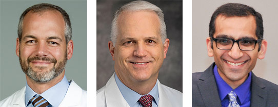 From left: Jeffrey Junko, M.D. (’00), Matthew L. Moorman, M.D., M.B.A., FACS, FAWM, FCCM, and Mehool Patel, M.D. (’98)