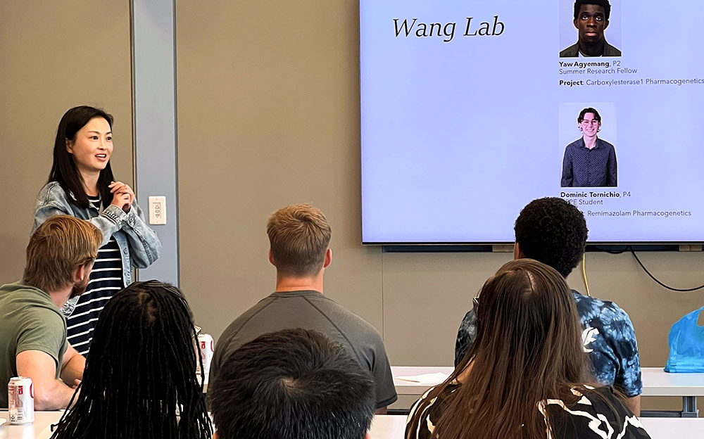 After enjoying refreshments together, PharmSci lab faculty members shared what students learned during their time in the labs and praised the impact of their work over the summer.