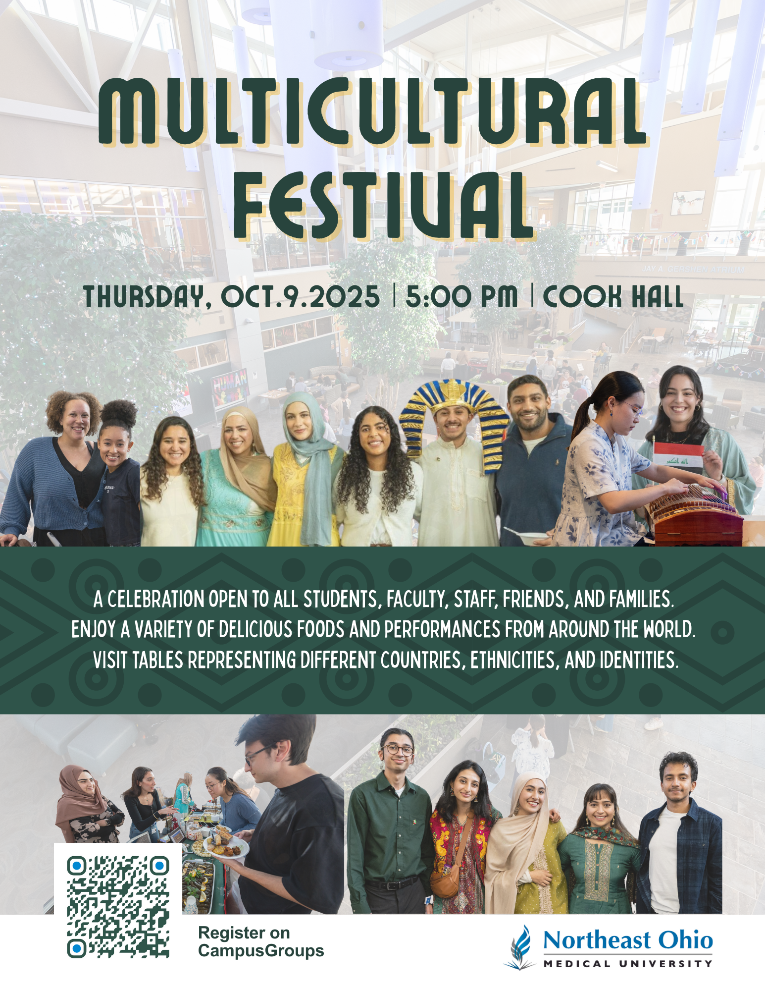 Join us for the Multicultural Festival at NEOMED from 5-7 p.m. on Thursday, October 9, in Cook Hall. The celebration is open to all students, faculty, staff, friends, and families. Savor a variety of delicious foods and enjoy performances from around the world. Visit tables representing different countries, ethnicities, and identities. The Multicultural Festival is a fantastic opportunity to meet new people, make friends, and appreciate our unique cultural differences.