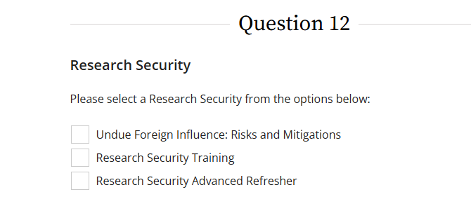 Scroll through the course options and at question 12, select “Research Security Advanced Refresher.” You will likely have to answer the other questions as “Not at this time.”