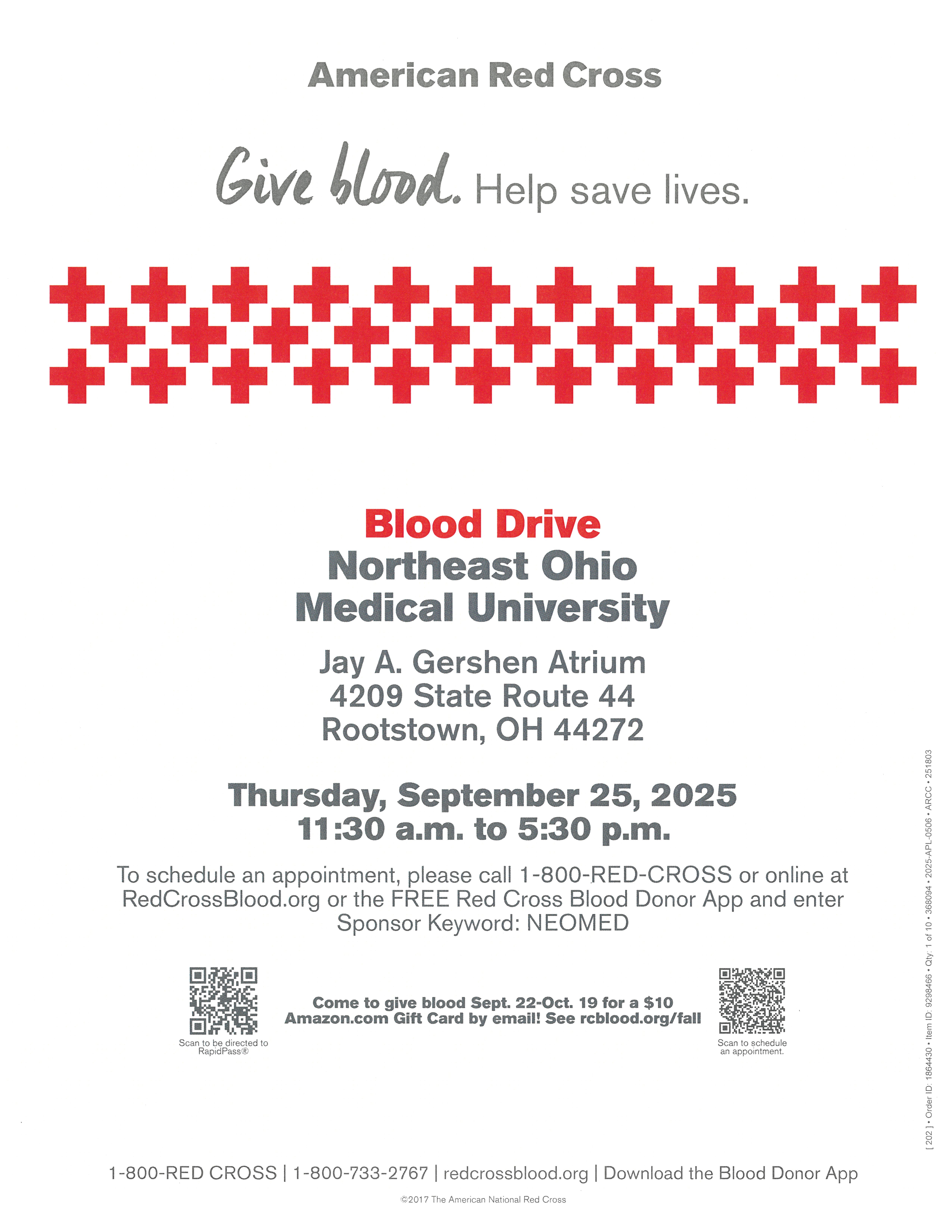The American Red Cross blood drive will be at NEOMED on Thursday, Sept. 25, from 11:30 a.m. to 5:30 p.m. in Jay A. Gershen Atrium in the NEW Center.