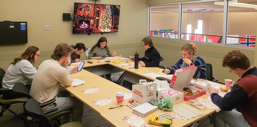 Eight members of the Phi Delta Epsilon medical fraternity got together to write 38 letters to older adults at Swanton Valley Rehabilitation and Healthcare Center to help fight isolation during the holidays. The letter writing activity was part of a Letters Against Isolation campaign.