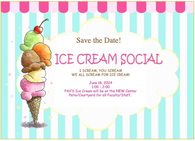 The next Sweet Treats Social for faculty and staff will be from 1-2 p.m. Tuesday, June 18, in the NEW Center patio/courtyard.