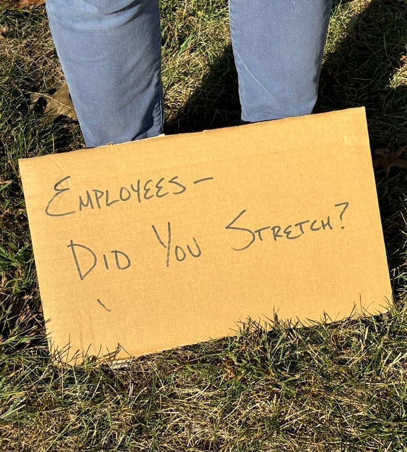 An early power struggle over who would be the employee team captain was diplomatically settled by an impromptu trivia challenge pertaining to “famous captains.” Perry Alexandrides bested challenger Liz Bacus in this endeavor and thus took on the illustrious role that in fact served no purpose beyond showing up for the coin toss, winning it by virtue of the student representative guessing incorrectly. The employees elected to kick first, perhaps having the foresight to get everyone home half an inning earlier.
