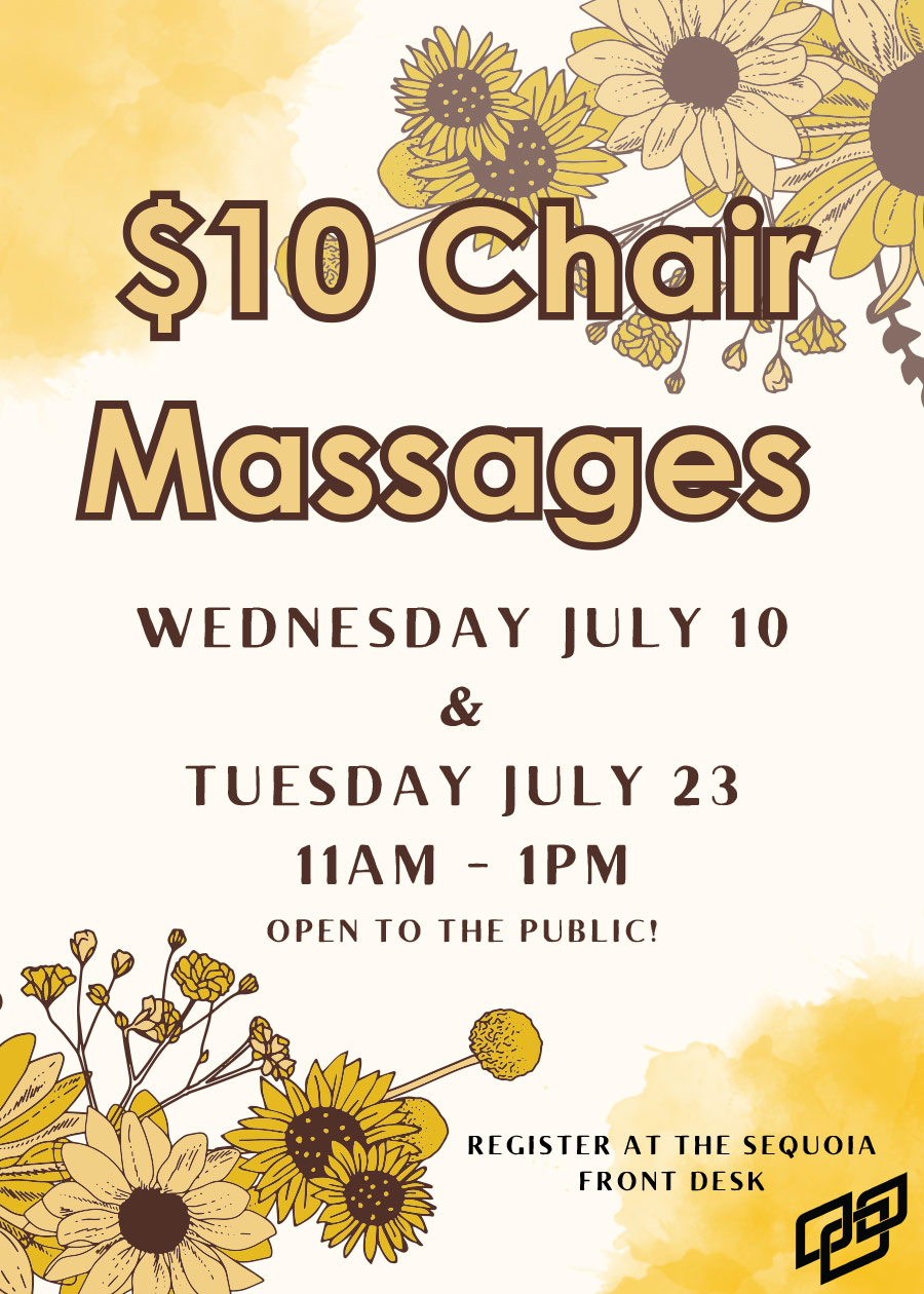 Call 330-325-6102 or stop by the Sequoia Wellness front desk to reserve a $10, 10-minute, chair-massage time on Wednesday, July 11, and Tuesday, July 23, from 11 a.m. to 1 p.m. in the NEW Center atrium.
