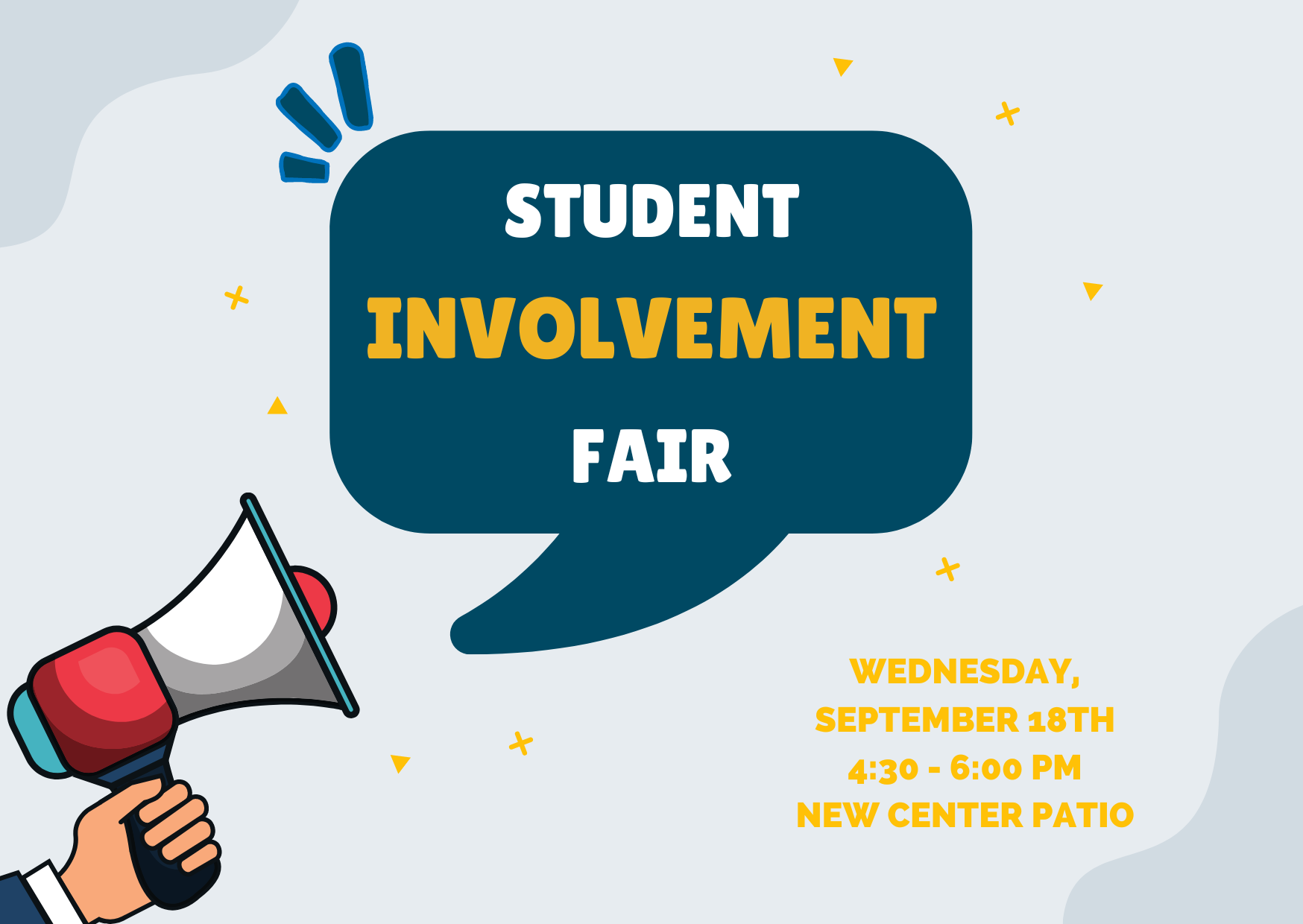 The Student Involvement Fair will be held on Wednesday, Sept. 18, from 4:30 - 6 p.m. on the NEW Center patio. We hope to see your smiling faces as you discover new things you'd like to be a part of!