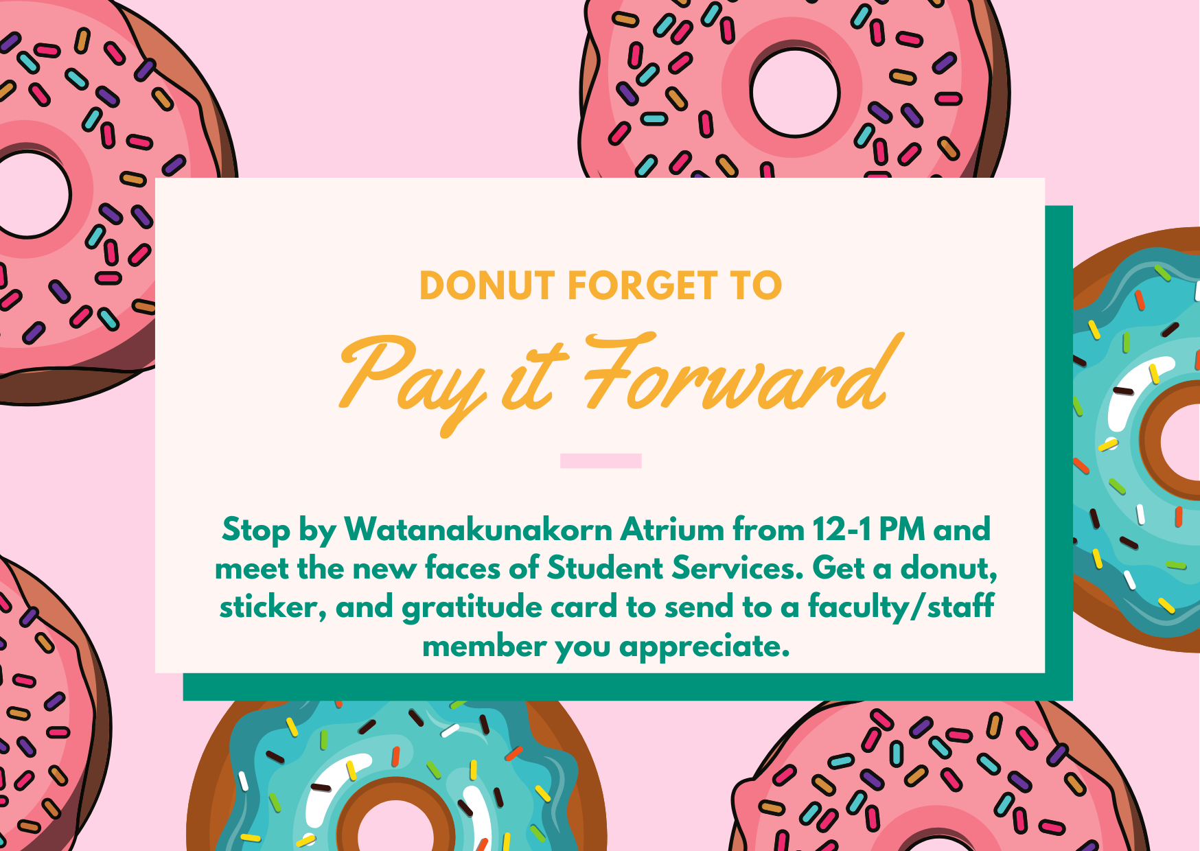 Stop by the atrium outside of Watanakunakorn Auditorium from noon to 1 p.m. today (Feb. 13) and meet the new faces of Student Services! Grab a donut, sticker and gratitude card to send to a faculty or staff member who you appreciate.