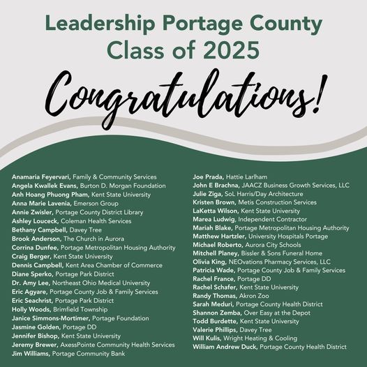 Through a nine-month interactive experience, participants gain a deep understanding of the county’s opportunities and challenges, while receiving professional development to build their leadership skills. Leadership Portage County, a 501(c)(3) non-profit organization, focuses on developing leaders to enhance the county’s economic, business, governmental, educational, cultural, social, and civic development.