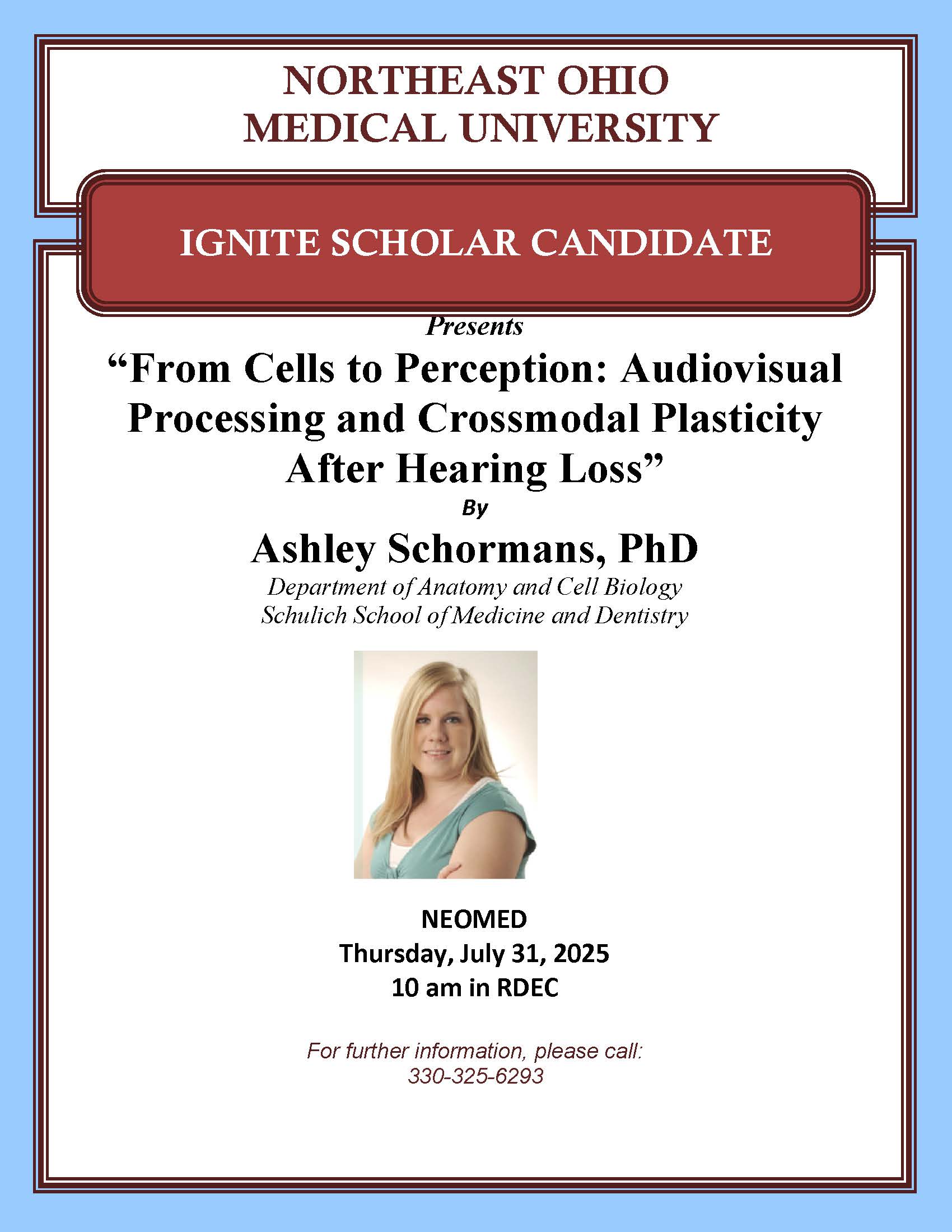 Ignite Scholar candidate Ashley Schormans, Ph.D., Department of Anatomy and Cell Biology, Schulich School of Medicine and Dentistry, Western University, will present “From Cells to Perception: Audiovisual Processing and Crossmodal Plasticity After Hearing Loss” Thursday, July 31, 2025 at 10 a.m. in RDEC.