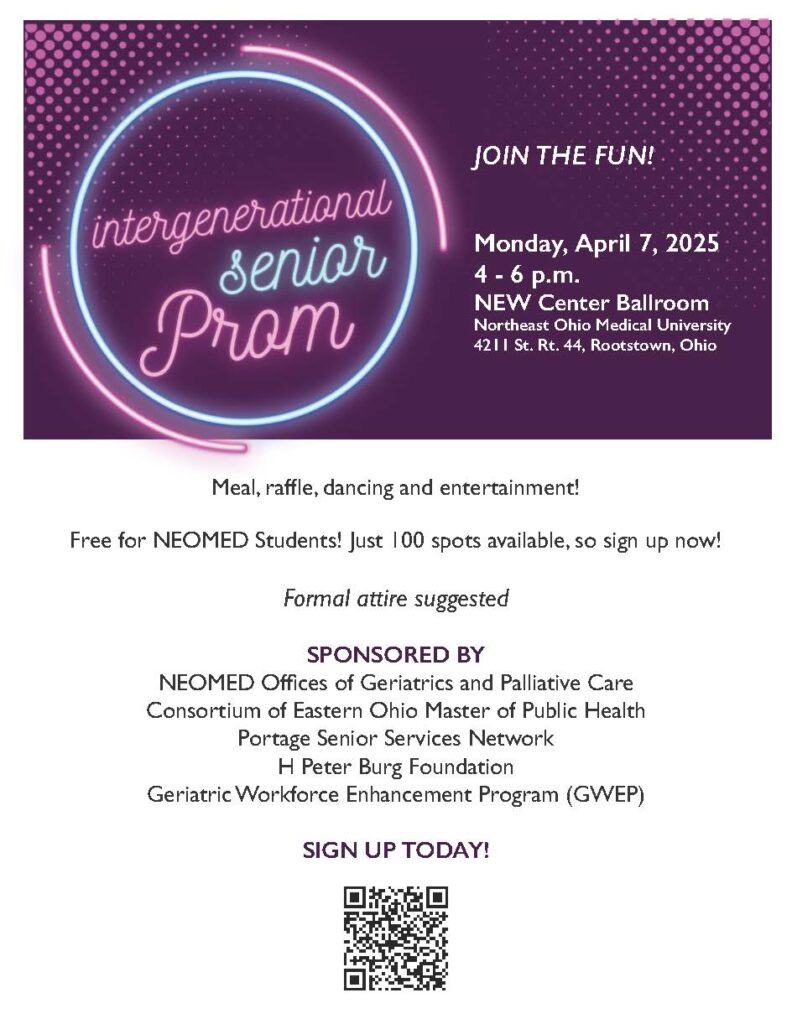 The Intergenerational Senior Prom is sponsored by the NEOMED Offices of Geriatrics and Palliative Care, the Consortium of Eastern Ohio Master of Public Health , Portage Senior Services Network, H Peter Burg Foundation and the Geriatric Workforce Enhancement Program (GWEP) at NEOMED.