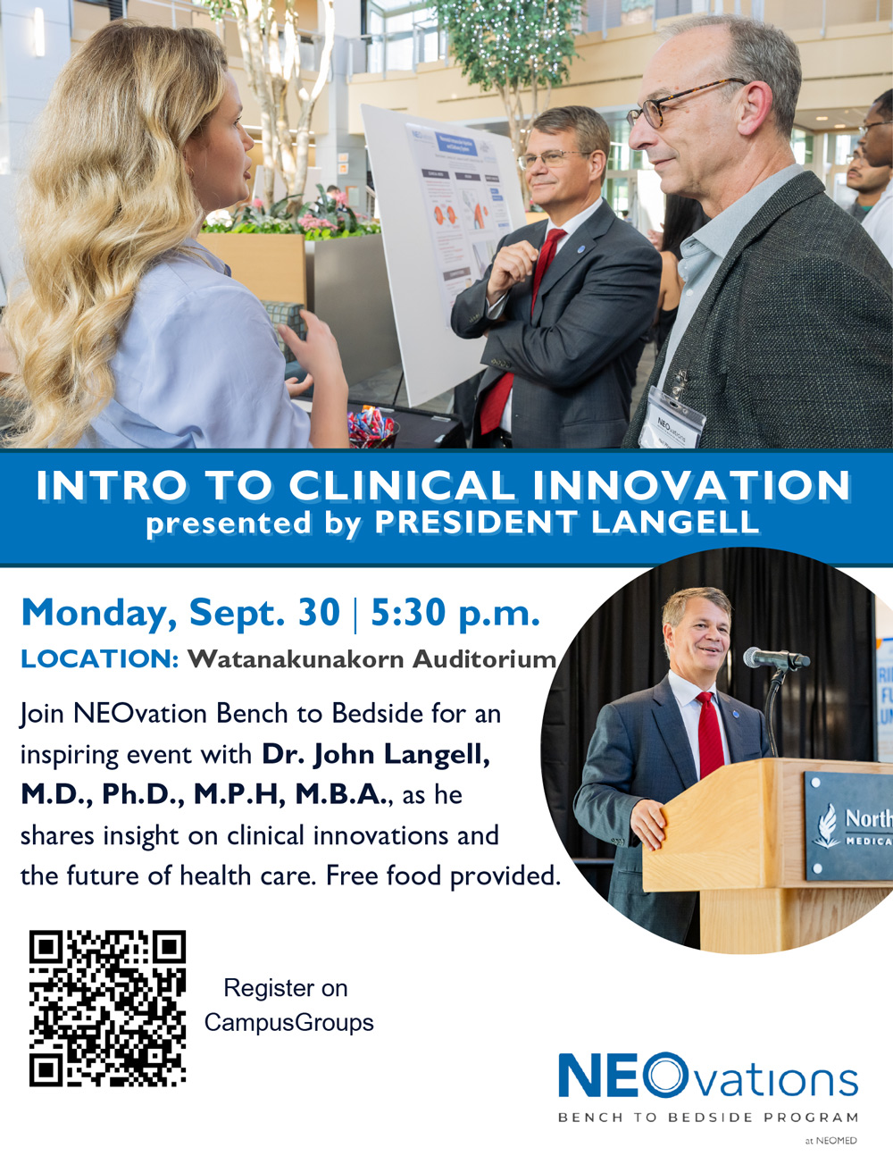 We are excited to announce a special event hosted by NEOvations Bench to Bedside! Join us for an inspiring talk by Dr. John Langell, M.D., Ph.D., M.P.H., M.B.A., president of NEOMED, titled "Intro to Clinical Innovation," where he will share his expertise and insights into the future of health care innovation and clinical advancements.