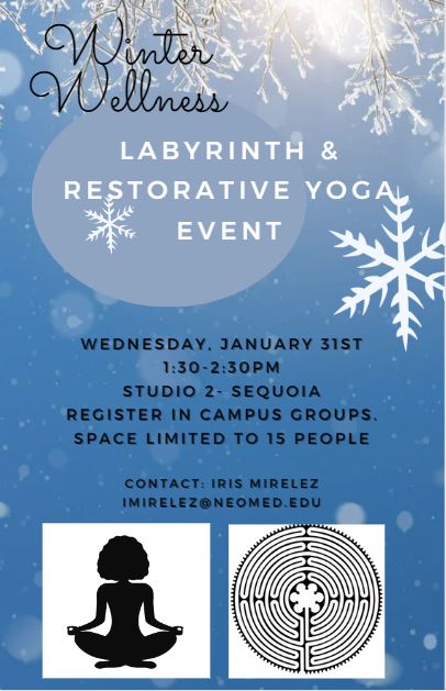 Students are invited to join Iris Mirelez, M.Ed., for an hour-long blend of a labyrinth and restorative yoga from 1:30-2:30 p.m. Wednesday, Jan. 31, in Studio #2 in the Sequoia Wellness Center.