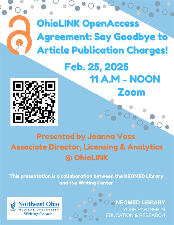 NEOMED faculty, staff, and students: Did you know you can publish your research for free in open-access journals? Join us for Open Access Overview with OhioLINK: Get Funding to Publish Your Manuscript on Tuesday, Feb. 25, from 11 a.m. to noon on Zoom to learn how you can take advantage of this opportunity.
