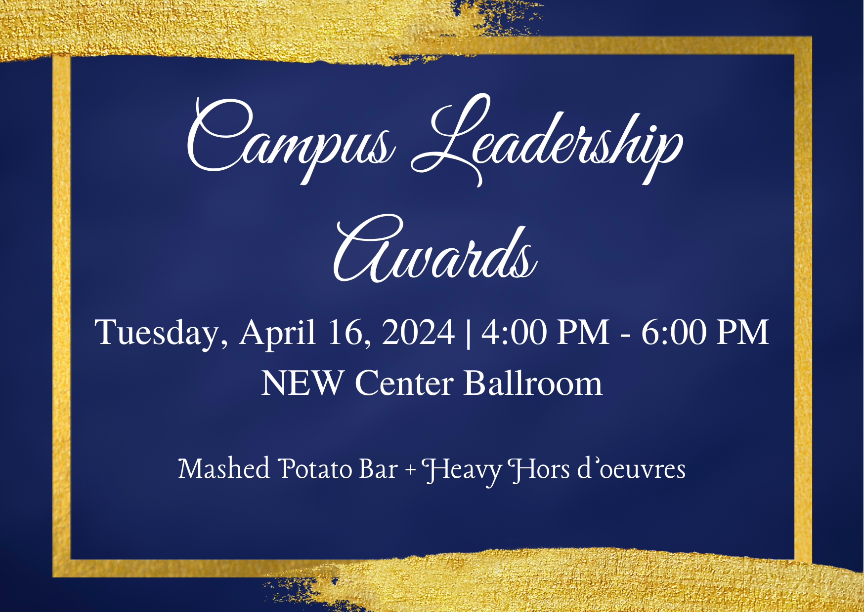 Save the date! Campus Leadership Awards will be held on Tuesday, April 16 at 4 p.m. in the NEW Center Ballroom.