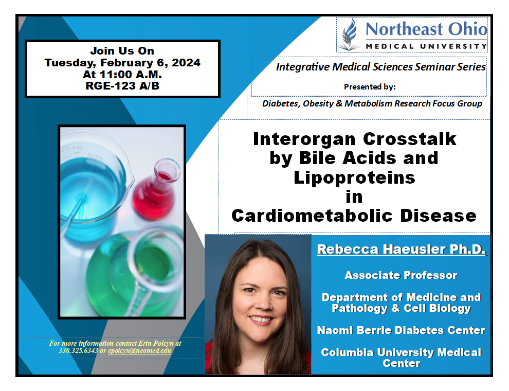 "Interorgan Crosstalk by Bile Acids and Lipoproteins in Cardiometabolic Disease" will be presented by Rebecca Haeusler, Ph.D., associate professor in the Department of Medicine and Pathology & Cell Biology, Naomi Berrie Diabetes Center at Columbia University Medical Center, at 11 a.m. Tuesday, Feb. 6, in RGE-123 A/B.