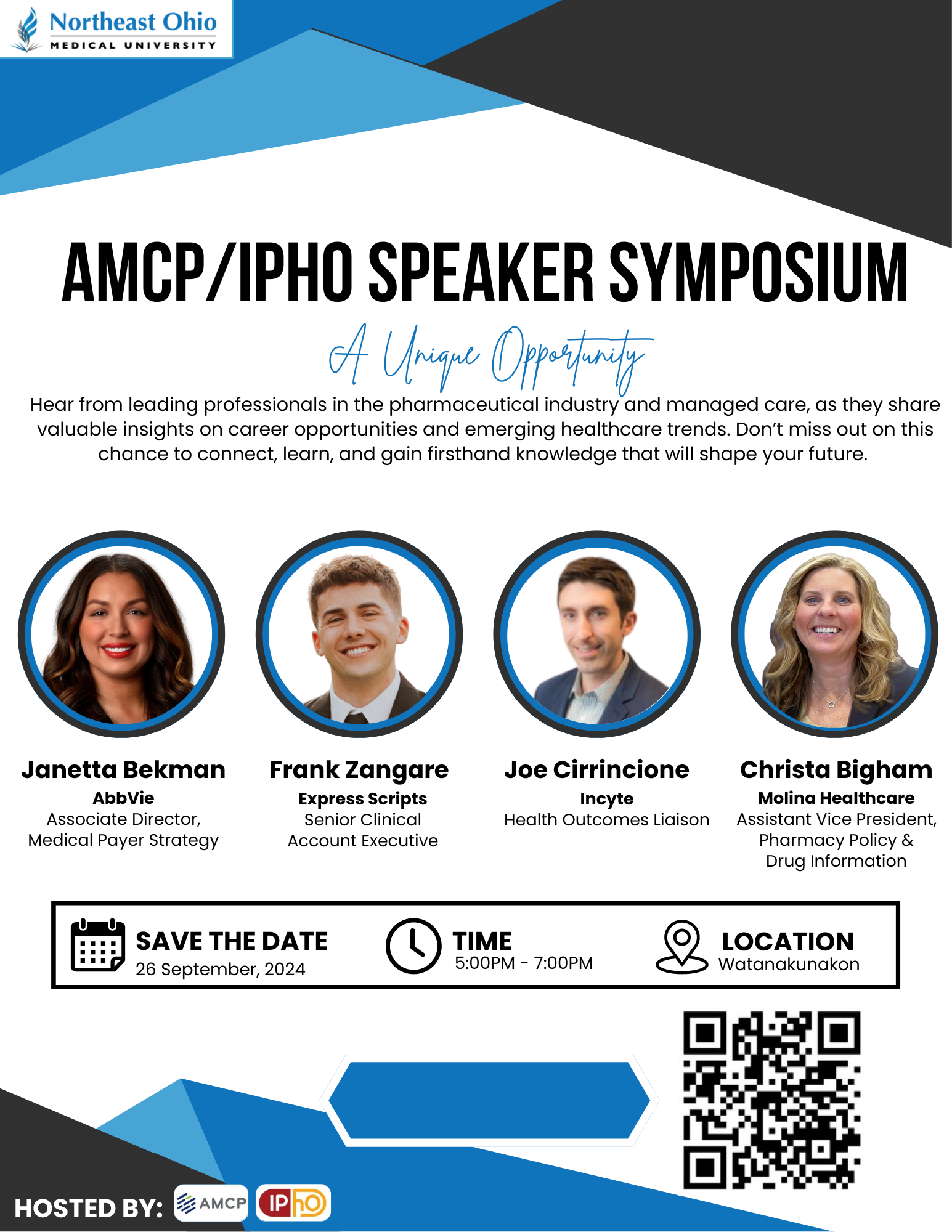 The Academy of Managed Care Pharmacy (AMCP) and Industry Pharmacists Organization (IPhO) student organizations invite you to a Symposium Event on Thursday, September 26 from 5 – 7 P.M. in Watanakunakorn Auditorium.