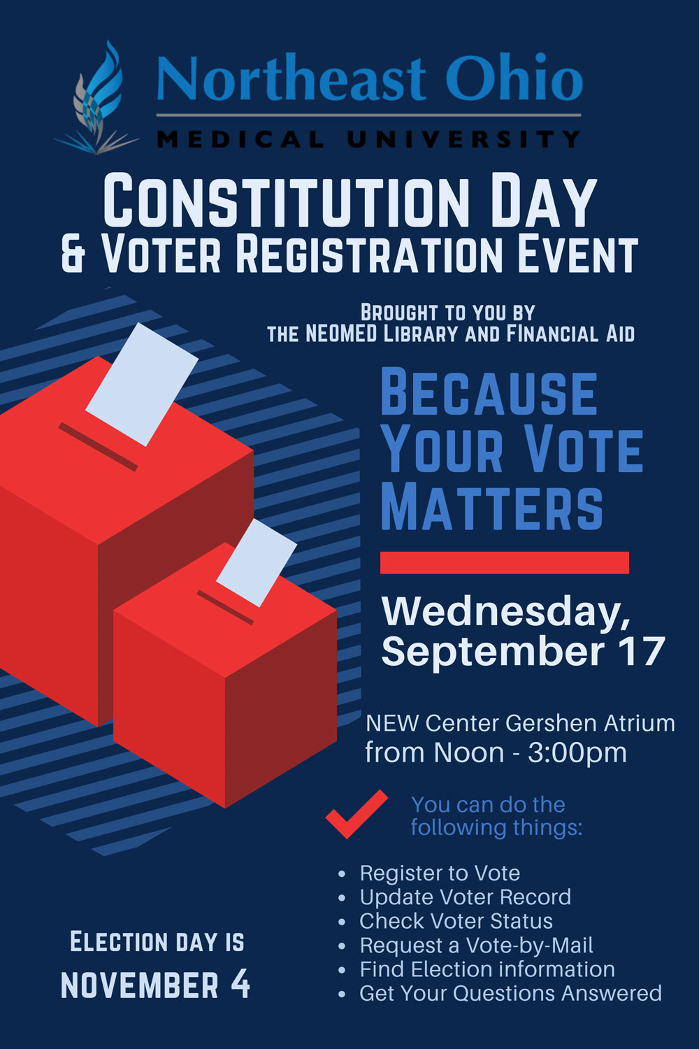 Join the NEOMED Library and Financial Aid for a voter registration event on Constitution Day, Wednesday, Sept. 17. The event will be held from noon to 3 p.m. in the Jay A. Gershen Atrium of the NEW Center.