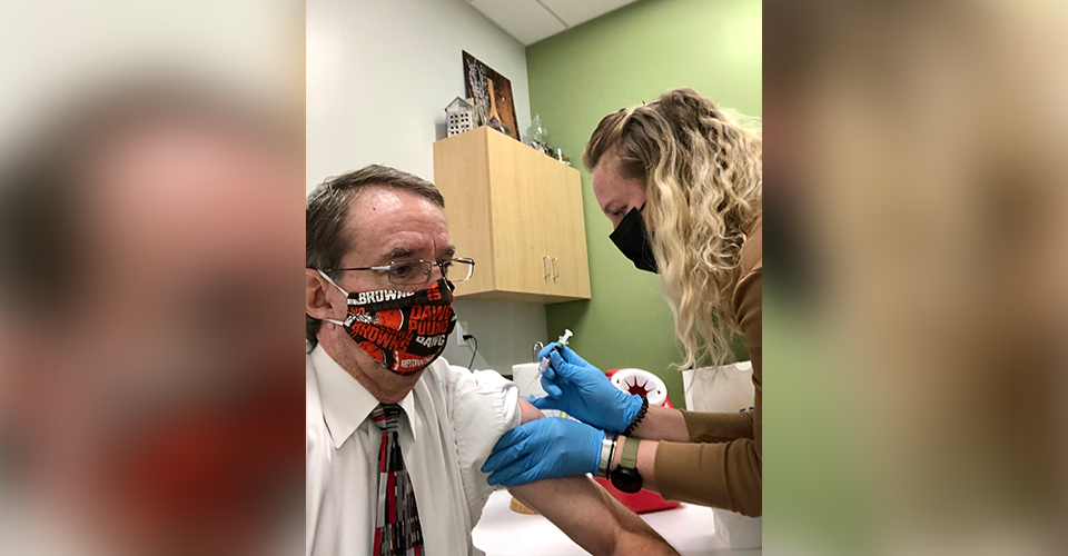 Joseph Zarconi, M.D. (’81), NEOMED’s medical director in response to the COVID-19 pandemic, received his shot this week at Rootstown Community Pharmacy by Pharmacist-in-Charge Hannah Cross, Pharm.D. (’13).